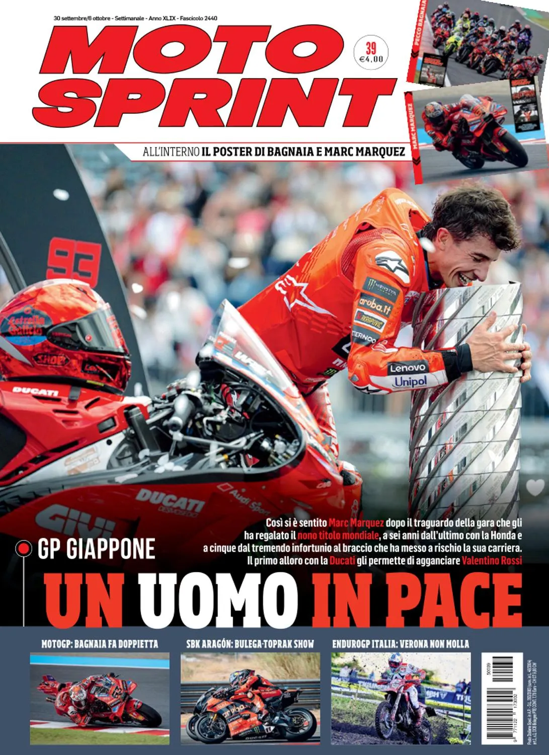 Motosprint è il "settimanale in pole position" della Casa editrice. Il “fratellone” di Autosprint, nato nel 1976 quando si decise di allargare alle due ruote l’esperienza fatta nelle auto. Qui troverai interviste inedite, analisi di gara, aggiornamenti di stagione, insight su moto, piloti e team. Specula insieme a noi sui risultati di gara, analizza i passi più entusiasmanti dei circuiti e diventa esperto non solo di MotoGP. Con Motosprint sarai accompagnato nelle gare di tutto il racing a due ruote, con un occhio esperto sulla Superbike senza dimenticarsi di Moto2 e Moto3.